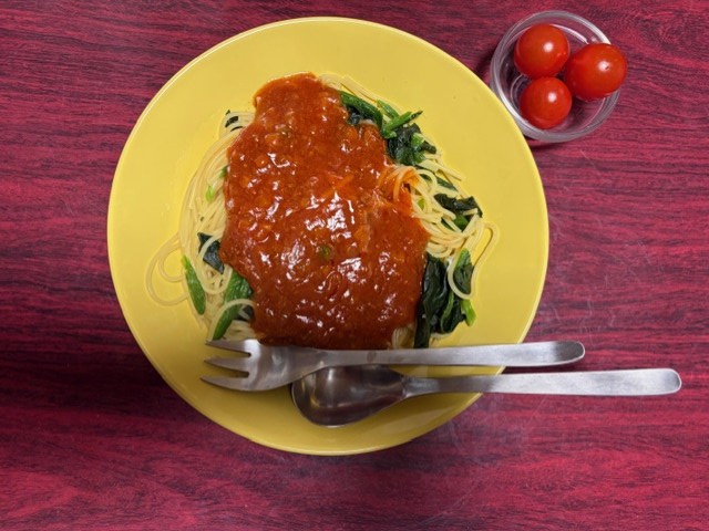 麺を茹でている途中に卵と冷凍ホウレンソウを入れて、しっかりお湯をきってミートソースをかけます。